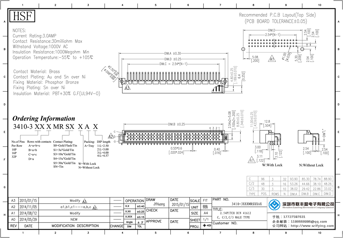 產(chǎn)品分類:DIN 41612連接器 產(chǎn)品型號:聯(lián)豐盈 2.54間距 3*16P 90度 彎插型 公座 DIN41612 板對板 連接器 技術(shù)參數(shù):額定電流:3.0amp電流電阻:30m最大耐壓:1000V的交流/直流絕緣電阻:1000分鐘