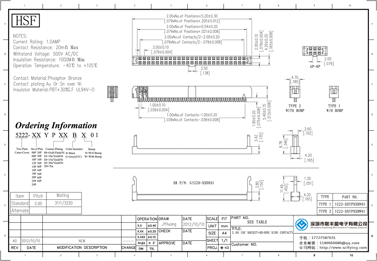 產(chǎn)品分類:IDC插座連接器 產(chǎn)品型號: 2.00 彈片型 磷銅 IDC 聯(lián)豐盈 技術(shù)參數(shù):額定電流:1.0amp電流電阻:20m最大絕緣電阻:1000mmin耐壓:1000V AC /分鐘工作溫度:40﹣℃+ 105℃接觸材料:黃