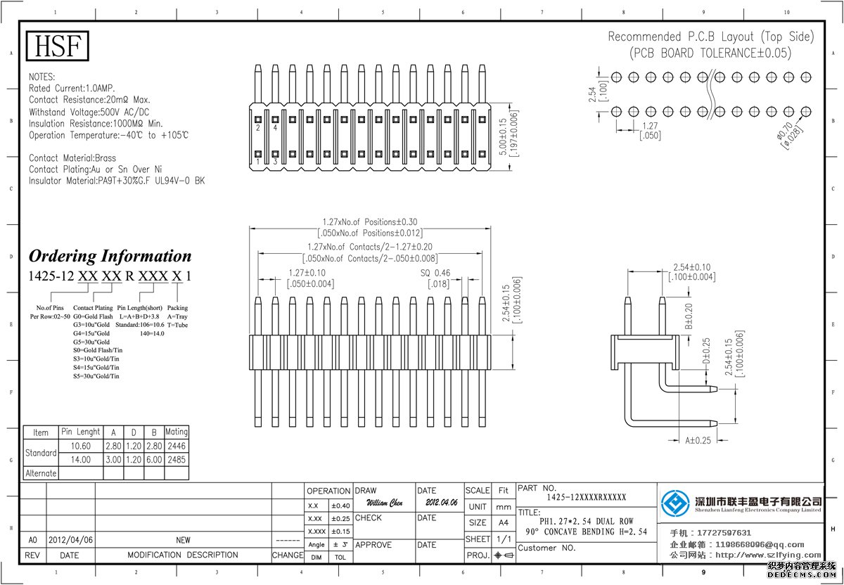 產(chǎn)品規(guī)格:1.27*2.54 雙排 90° DIP 排針 UL認(rèn)證