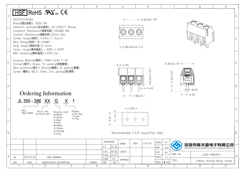 產品分類:接線端子 產品型號:螺釘式PCB接線端子 間距3.50/3.96mm 詳細型號:螺釘式PCB接線端子-JL350,間距3.50/3.96mm,CE認證,UL證書 產品介紹:材質電鍍(MATERIAL) , 螺絲(Screw)M2.0,鋼,