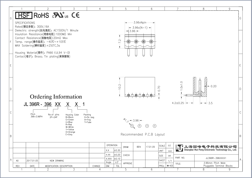 產(chǎn)品分類:接線端子 產(chǎn)品型號:插拔式接線端子 間距3.96mm 詳細型號:插拔式接線端子-JL396R,間距3.96mm,CE認證,UL證書 產(chǎn)品介紹:材質(zhì)電鍍(MATERIAL) , 螺絲(Screw)M2.0,鋼,鍍鋅Steel,