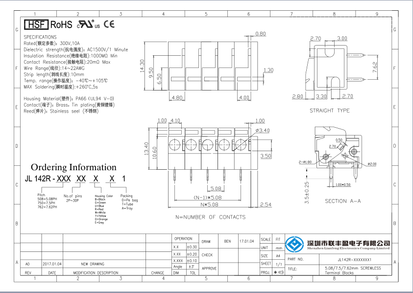 產(chǎn)品分類:接線端子 產(chǎn)品型號(hào):PCB接線端子 間距5.08/7.5/7.62mm 產(chǎn)品介紹:材質(zhì)電鍍(MATERIAL) , 彈片(Reed)不銹鋼Stainless steel 焊針(Pin header)黃銅,鍍錫Brass,Tin plated 塑件(Housing)P