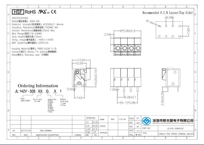 產(chǎn)品分類:接線端子 產(chǎn)品型號(hào):彈簧式PCB端子 5.08/7.5/7.62mm 詳細(xì)型號(hào):彈簧式PCB接線端子-JL142V,間距5.08/7.5/7.62mm,CE認(rèn)證,UL證書 產(chǎn)品介紹:材質(zhì)電鍍(MATERIAL) , 彈片(Reed)不銹鋼Stai