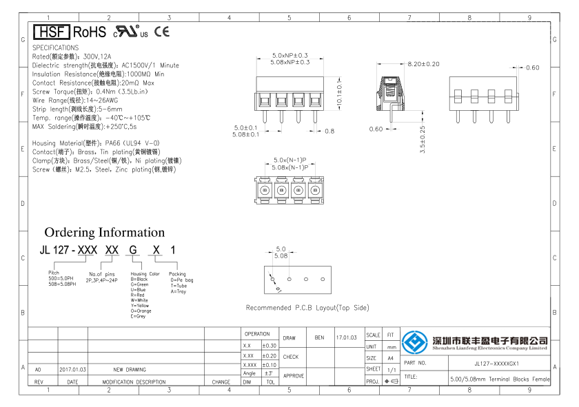 產(chǎn)品分類:接線端子 產(chǎn)品型號(hào):螺釘式PCB接線端子-127,間距5.00/5.08mm, 產(chǎn)品介紹:材質(zhì)電鍍(MATERIAL) , 螺絲(Screw)M2.0,鋼,鍍鋅Steel,Zinc Plated 彈片(Reed)黃銅,鍍鎳Brass,Ni plate