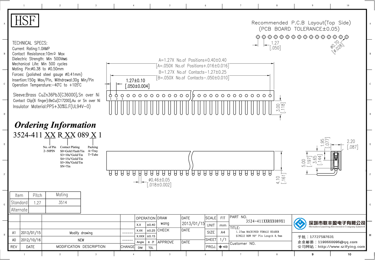 產(chǎn)品分類:圓孔排針排母連接器 產(chǎn)品型號(hào):1.27MM 單排 4爪型 圓孔排母 批發(fā) 廠家 技術(shù)參數(shù):額定電流:1.0amp接觸電阻:10m0 Max Dielectric強(qiáng)度:MIN 500vrm5機(jī)械壽命:最少500次交配銷:0.380.