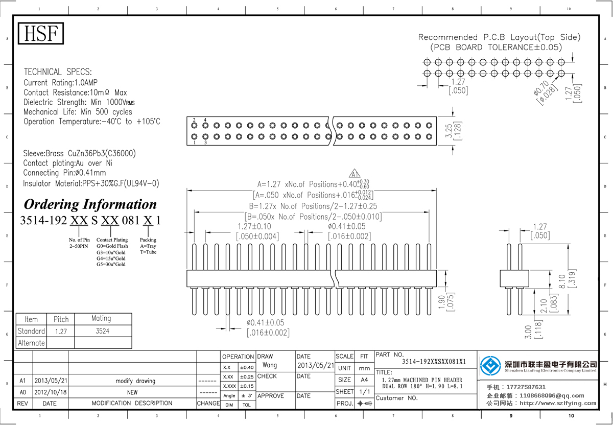 產品分類:圓孔排針排母連接器 產品型號:聯(lián)豐盈 1.27MM H=1.9 雙排 直插型 圓型排針 供應 技術參數(shù):額定電流:1.0amp接觸電阻:10m0 Max Dielectric強度:MIN 500vrm5機械壽命:最少500次交配銷