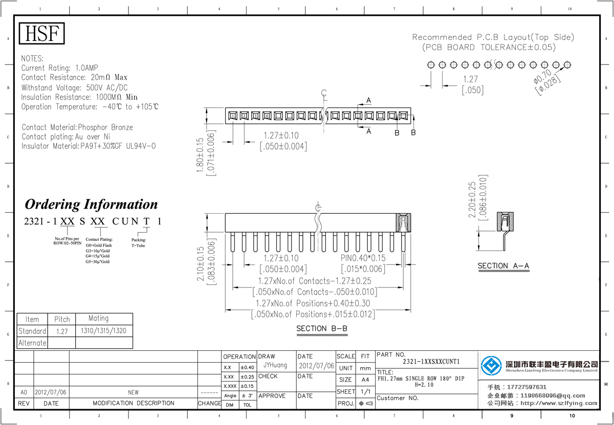 產(chǎn)品分類(lèi):排母連接器 產(chǎn)品規(guī)格:1.27MM 單排 180DIP 排母 供應(yīng) 聯(lián)豐盈廠(chǎng)家 產(chǎn)品介紹:額定電流:1.0amp電流電阻:20m最大絕緣電阻:1000m民承受電壓:AC 500V /分鐘工作溫度:55﹣℃+ 105℃接