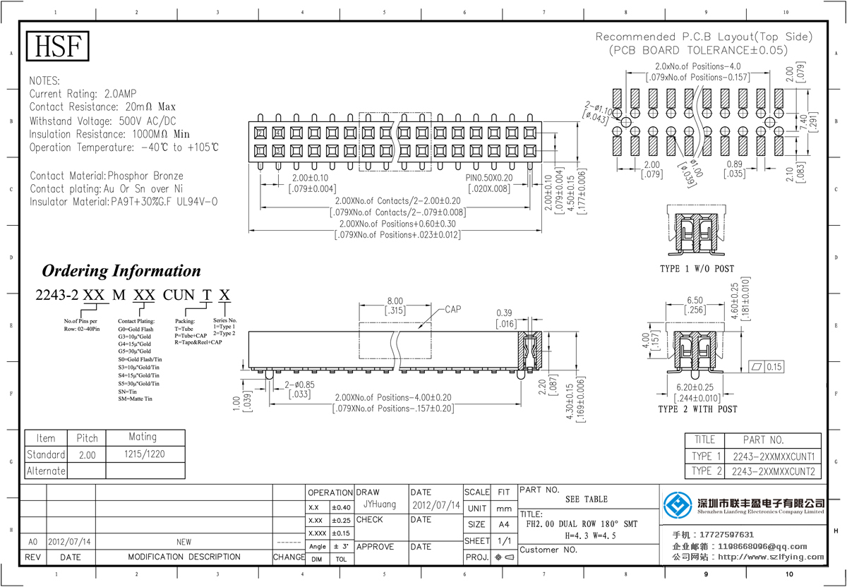 產(chǎn)品規(guī)格:聯(lián)豐盈 2.0mm 排母 SMT PA9T料黑色 H=4.3 連接器 生產(chǎn)商
