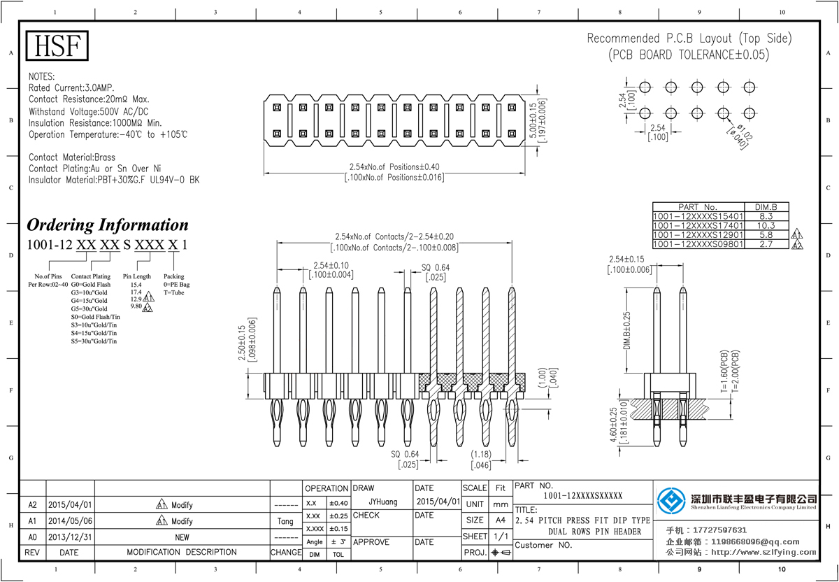 產(chǎn)品分類:排針連接器 產(chǎn)品型號:排針 2.54間距 單層雙排 壓接式 免焊式 產(chǎn)品介紹:額定電流:3.oamp。接觸電阻:2om最大承受電壓:500V的交流/直流絕緣電阻:1000m最低操作溫度:40℃