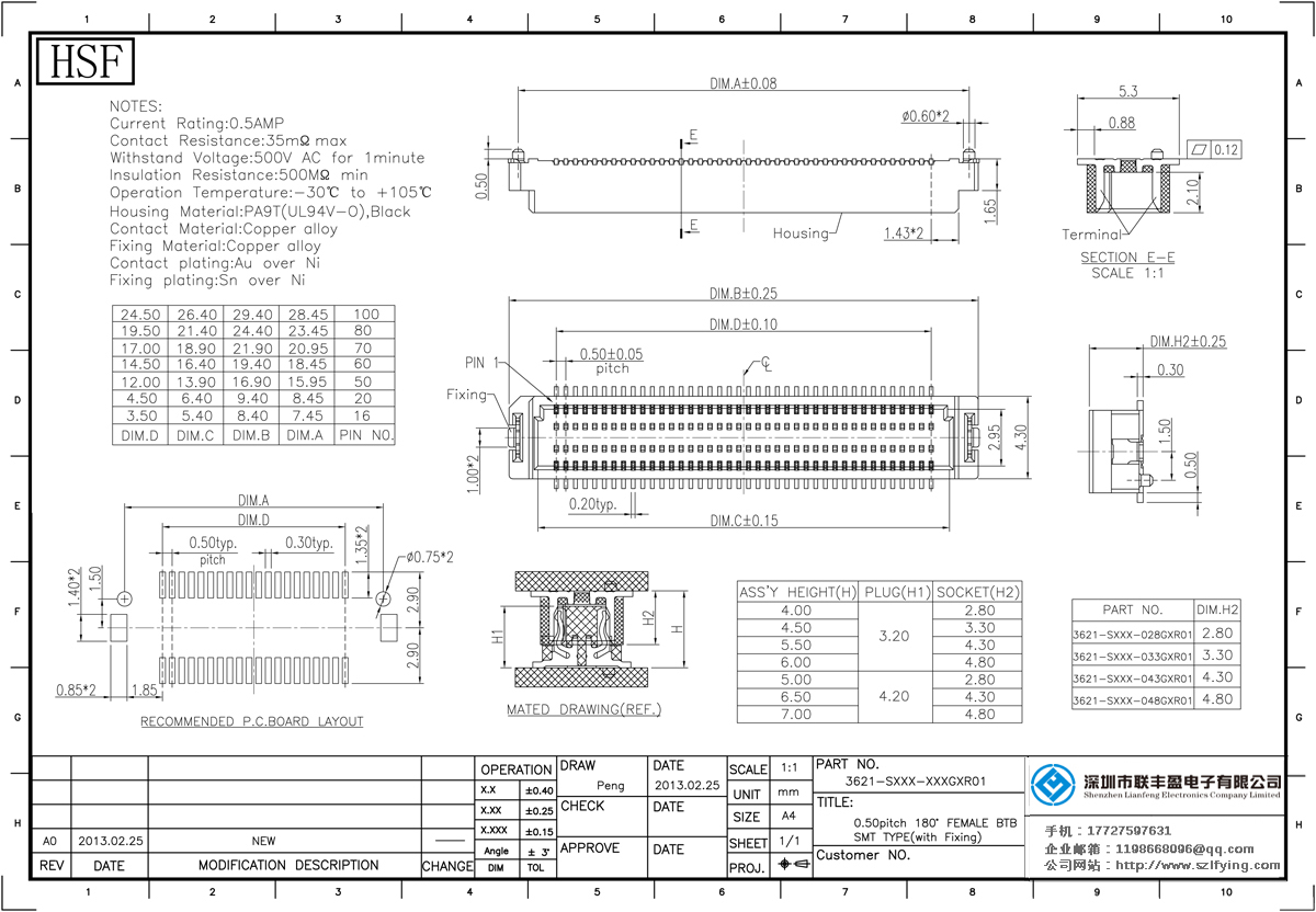 產(chǎn)品分類:Board To Board 連接器 產(chǎn)品型號:0.5間距 公座 單槽 板對板 連接器直銷 聯(lián)豐盈 技術參數(shù):額定電流:0.5amp電流電阻:30m最大絕緣電阻:100mmin耐壓50V的交流/分鐘:操作溫度: