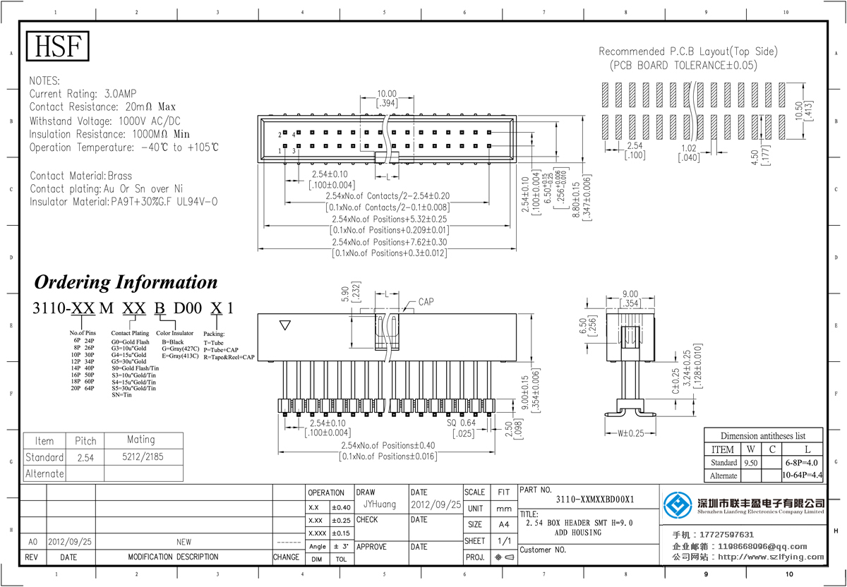 技術(shù)參數(shù):額定電流:3.0amp電流電阻:20mΩ最大承受電壓:500V的交流/直流絕緣電阻:1000分鐘操作溫度:40﹣℃+ 105℃接觸材料:黃銅觸點電鍍金或錫鎳絕緣體材質(zhì):PBT的+ 30% g.f UL94V-O