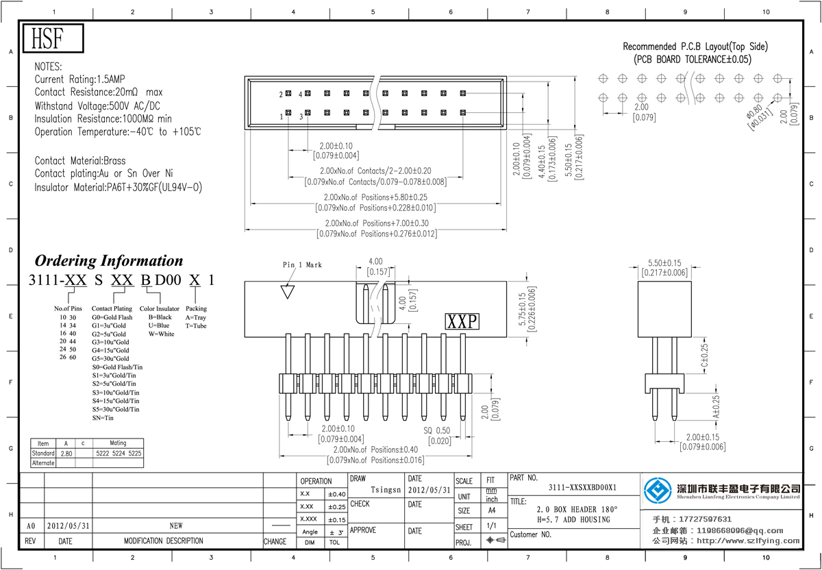 產品分類:簡易牛角連接器 產品型號:聯(lián)豐盈2.0MM 選鍍半金 180DIP 簡牛 生產 技術參數(shù):額定電流:2.0amp電流電阻:20m最大承受電壓:500V的交流/直流絕緣電阻:1000分鐘操作溫度:40﹣℃