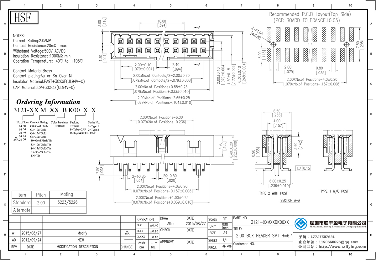 產品分類:簡易牛角連接器 產品型號:耐高壓 2.0MM TYCO型 180SMT 簡牛 廠家 技術參數(shù):額定電流:2.0amp電流電阻:20m最大承受電壓:500V的交流/直流絕緣電阻:1000分鐘操作溫度:40﹣℃